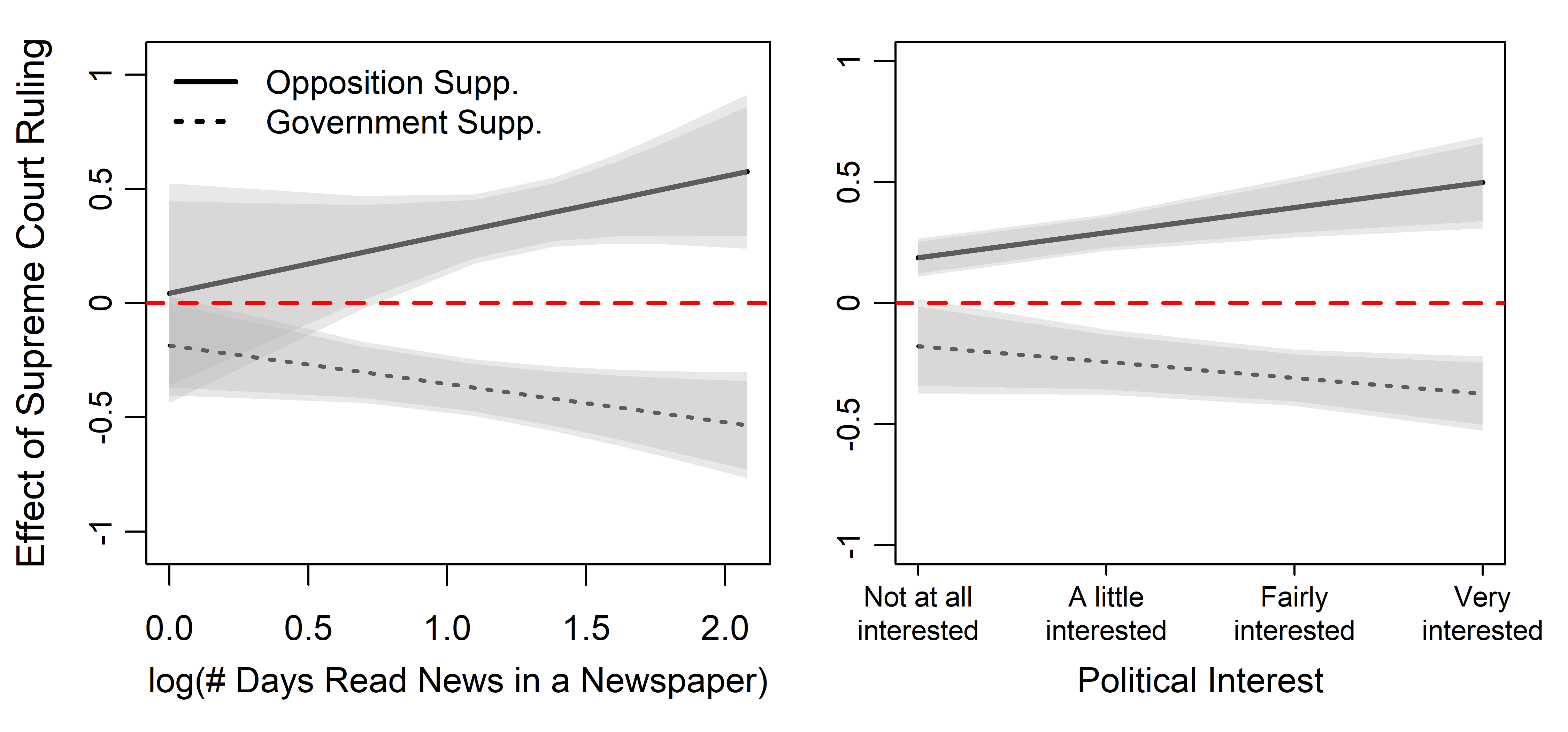 The partisan effects are larger among better informed and more politically interested respondents [Appendix][Replication Materials] -