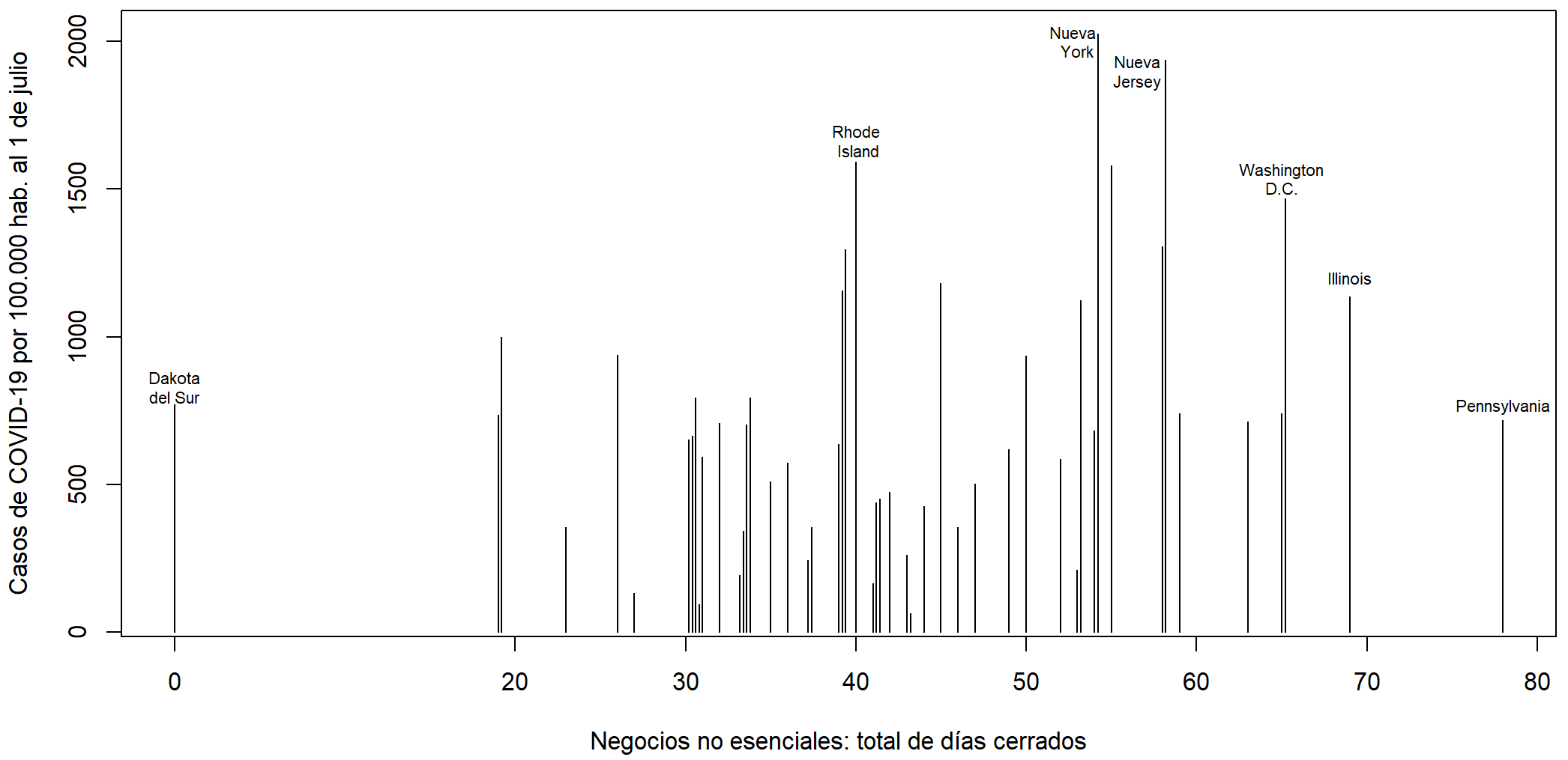 COVID-19 Cases Per 100,000 on July 1, by Days of Non-Essential Business Closure [Print] [PEX blog]
